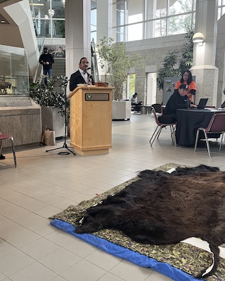 The two-day event began with guidance and a prayer from Elder Charlie Fox, Blood Tribe, AB and a reminder from co-chairs Dr. Tasha Hubbard and Candice Pete-Cardoso about the importance of “Nothing About Us, Without Us.” Eight Indigenous language groups were represented at the gathering. The importance of the buffalo from Indigenous perspectives was conveyed by the attendees representing the Blood Tribe, Dakota, Nakota and Cree peoples.